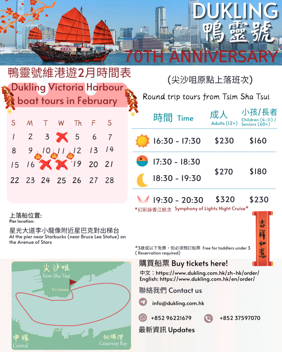 想乘坐這艘標誌性中式古董帆船,在維多利亞港觀光? 鴨靈號目前每日(除星期三外)提供日間和日落航班,以及幻彩詠香江夜間航班。快閱讀以下航程資訊,在網頁底部訂購船票吧!